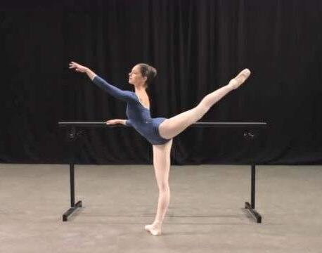 首先雙手把桿,主力腿小八子步打開,動力腿前腳點地。手位位芭蕾七位手手位,踢后腿時手位變化為三位手。