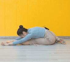 第一步:兩腿之間形成90度,胸部、胸口、下巴一次貼腿。