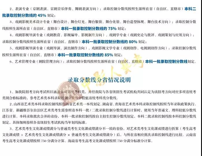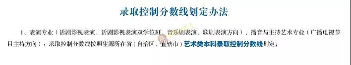 藝術類考生文化課成績滿分與普通類考生文化課成績滿分不一致的省份,對藝術類考生文化課成績進行折算(考生高考文化課成績÷藝術類考生文化課成績滿分×普通類考生文化成績滿分)后,與所在省相應批次錄取控制線進行比較。云南省考生高考文化課成績按照750分滿分計算。海南省考生高考文化課成績按照750分滿分標準分計算。