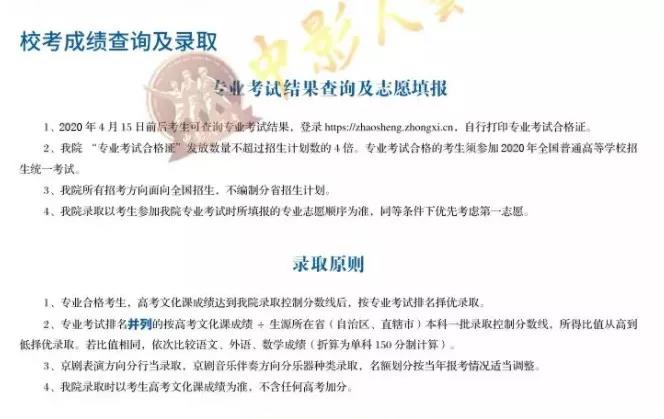 注:本簡章參考總結自2019年中戲招生簡章及中戲歷年招生簡章,其中招生專業、學費、各專業考試內容以及錄取原則等內容僅供考生及家長作為考前參考,望各位考生抓緊時間準備考試項目和作品,至于報名及考試時間還要坐等2020年招生簡章正式出爐,原則上安排在2019-2020學年度寒假考試后進行,藝術類專業校考一般安排在對應的省級統考之后。