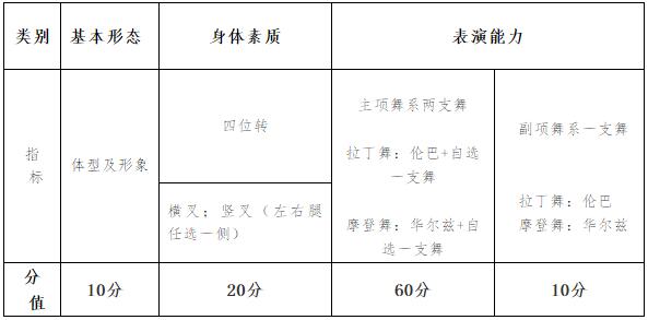 (2)成績評定:考官根據視頻對考生的體型條件進行評分;要求體型條件好,身高、臂長等條件具備學習舞蹈的要求。
