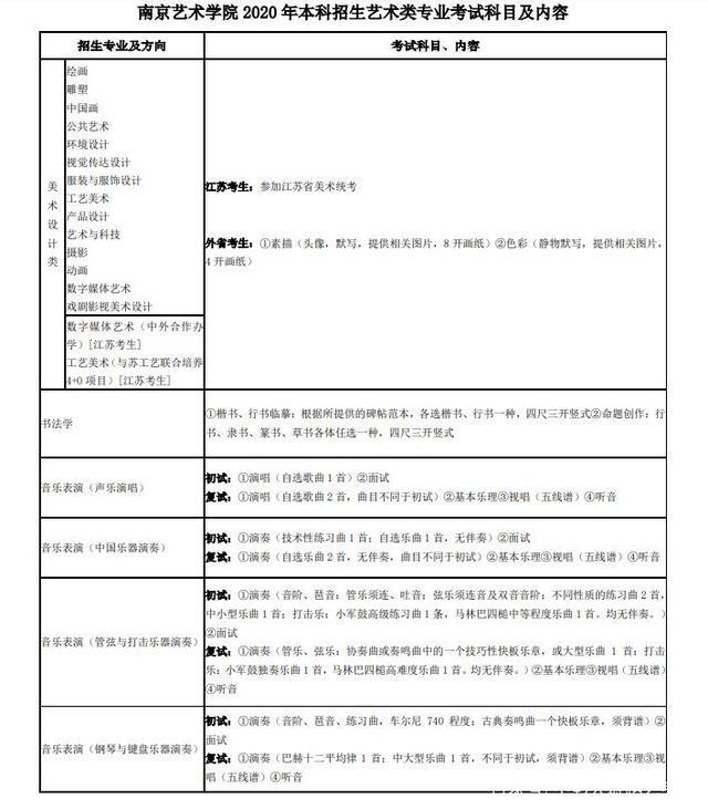南京藝術學院2020年藝術專業考試內容: