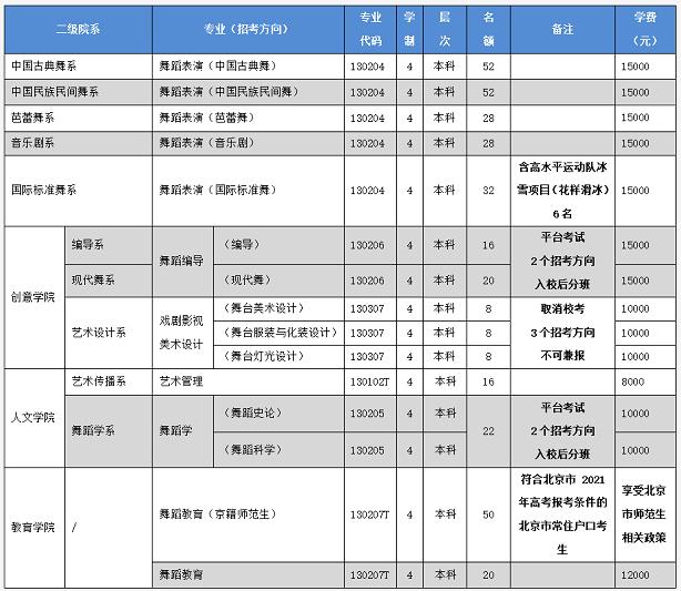 第十三條 舞蹈表演專業、舞蹈編導專業每人每學年15000元;舞蹈學、戲劇影視美術設計專業每人每學年10000元;舞蹈教育專業每人每學年12000元,舞蹈教育(京籍師范生)學費享受北京市師范生相關政策;藝術管理專業每人每學年8000元;住宿費:每人每學年900元/750元(根據住宿條件不同有所區分)。