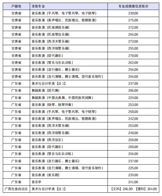 1. 投檔考生文化成績(jī)達(dá)到生源所在省份招生考試機(jī)構(gòu)劃定的藝術(shù)類本科文化錄取控制分?jǐn)?shù)線,按專業(yè)統(tǒng)考成績(jī)從高分到低分排序錄取的專業(yè)統(tǒng)考成績(jī)最低錄取分【分科類計(jì)劃(江蘇省、廣西壯族自治區(qū))按科類分別排序錄取