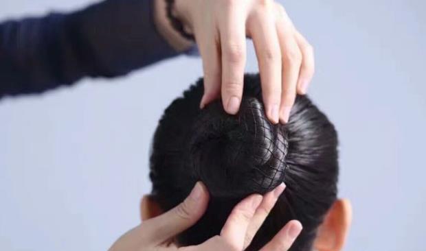 4、用發(fā)網(wǎng)將發(fā)髻套住,并把發(fā)髻捏平按扁。